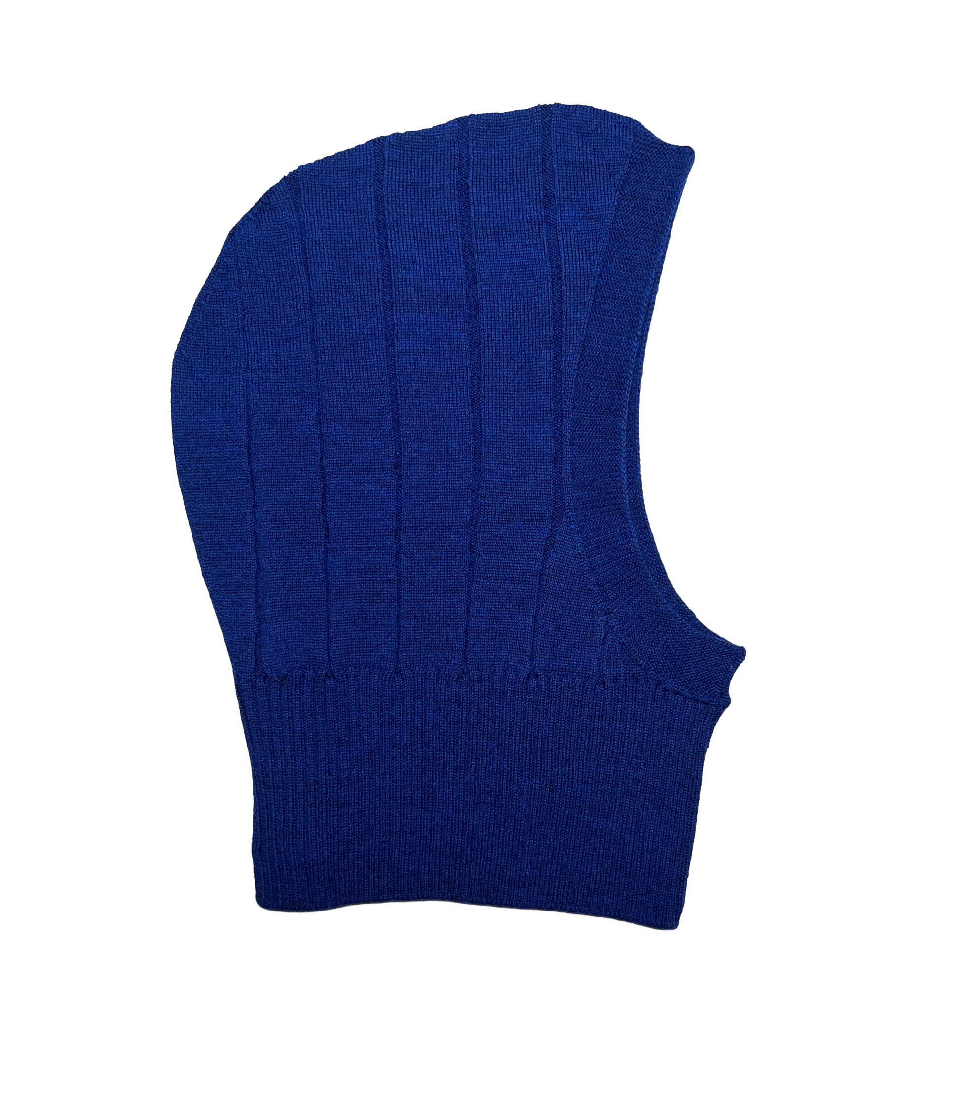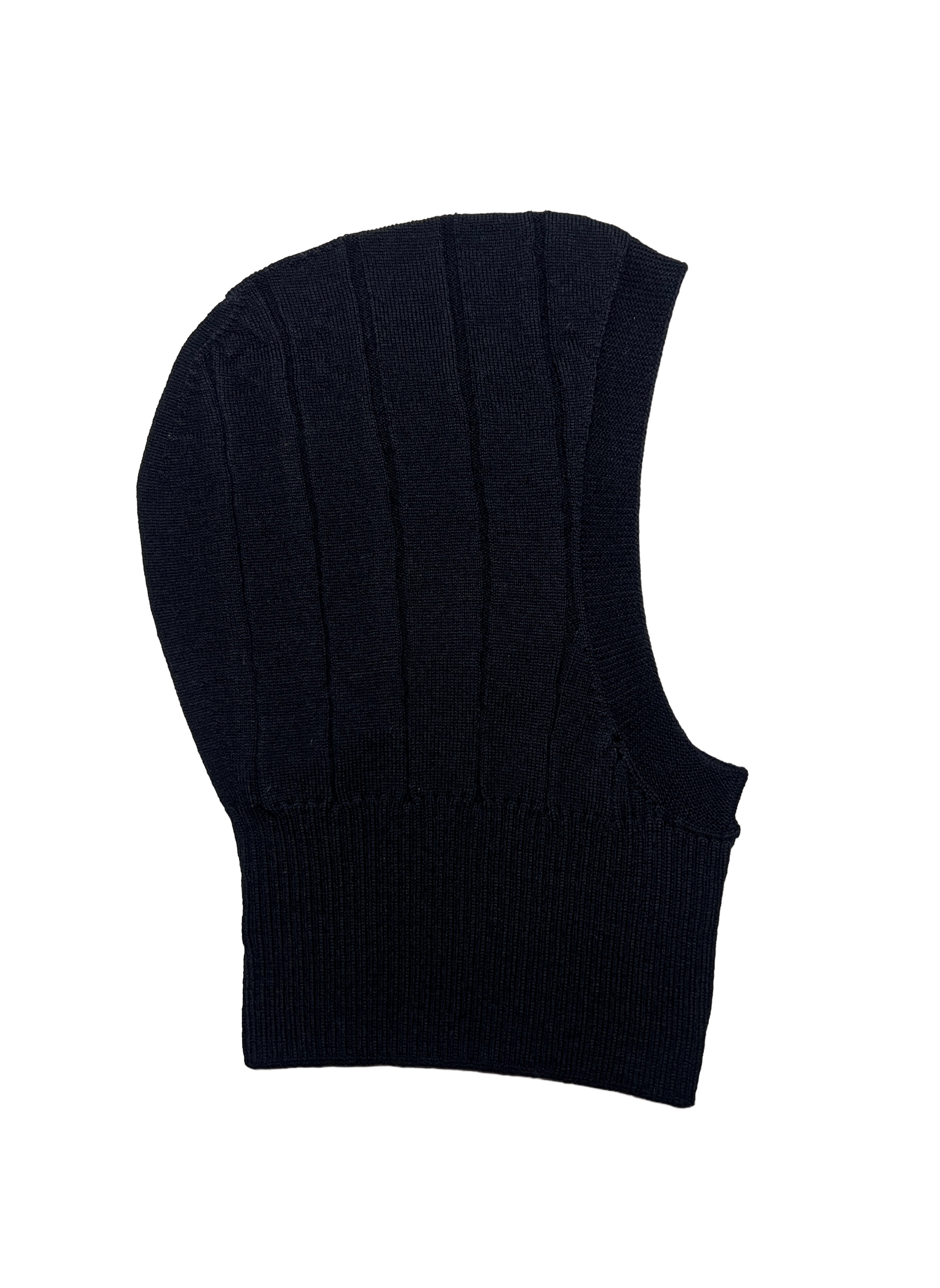 A lightweight 3D knit balaclava with ribbing around the face and neck and a wide rib on the body of the hood.
