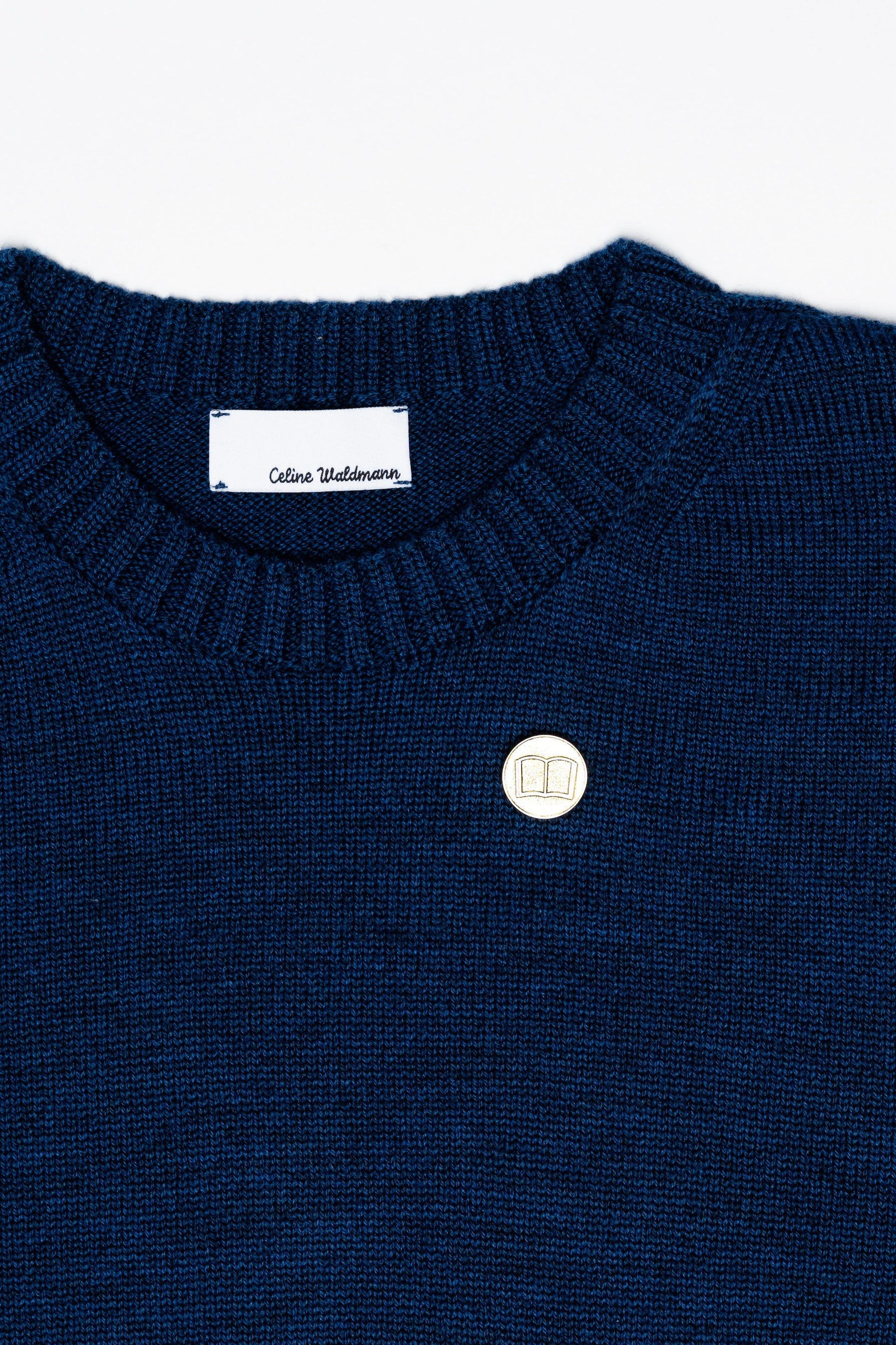 A circular gold tone pin die struck with our book logo. Butterfly clasp at back.