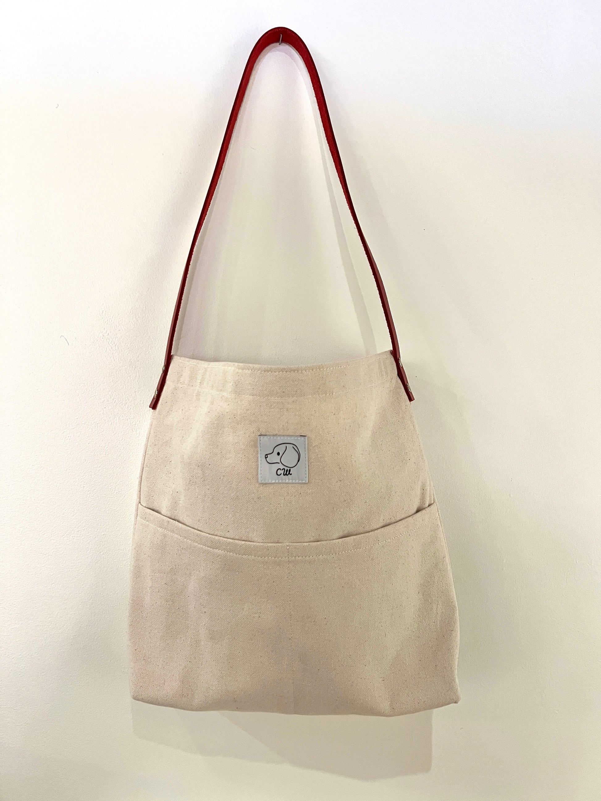 A variation on our book pocket bag! This time with a single strap made from salvaged leather, which has been riveted at each side seam. The tote body is made from mid-weight cotton canvas or denim with two book pockets and a triangle gusseted bottom, giving the tote more of a hobo shape. Finished off with a Jimmy logo patch.