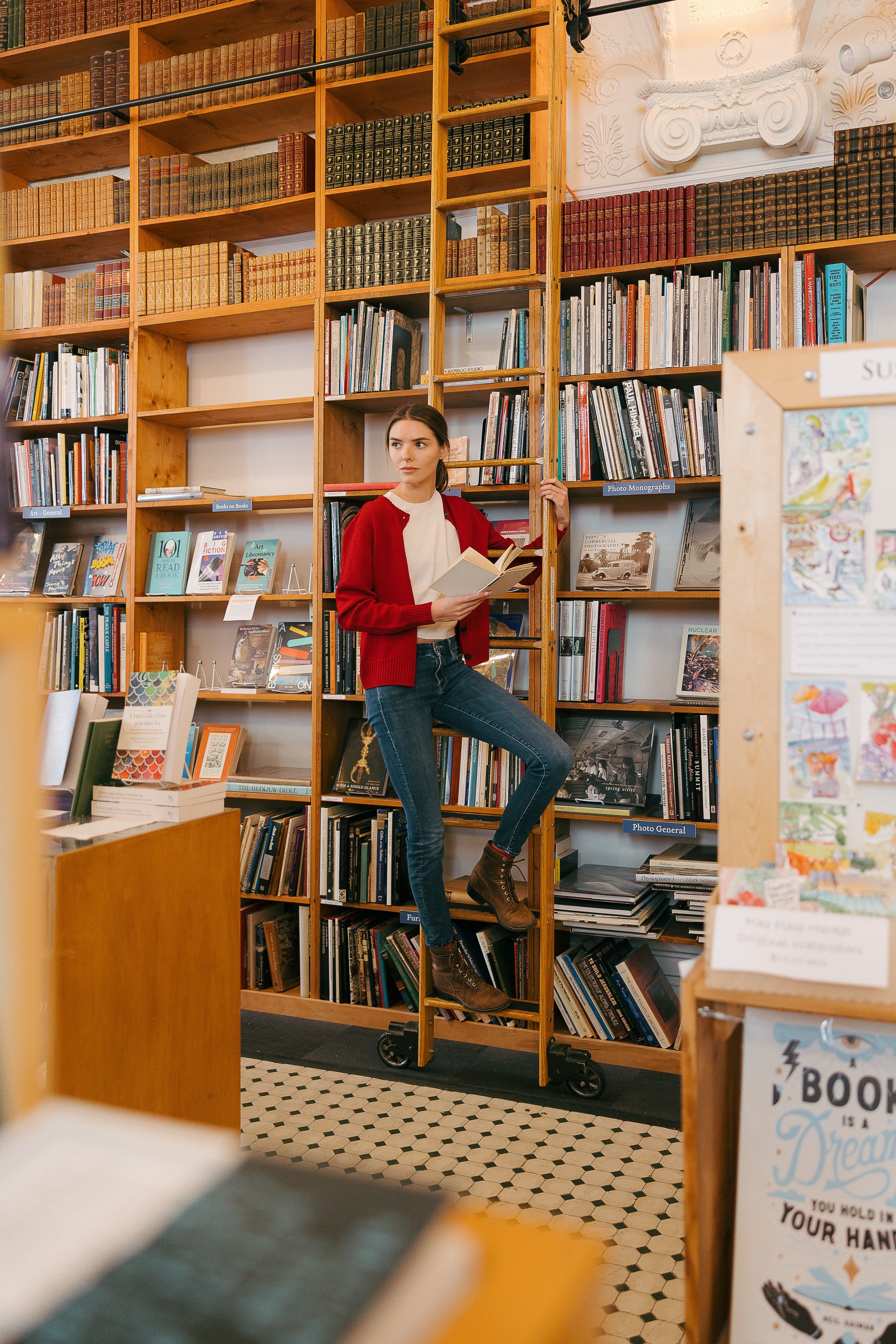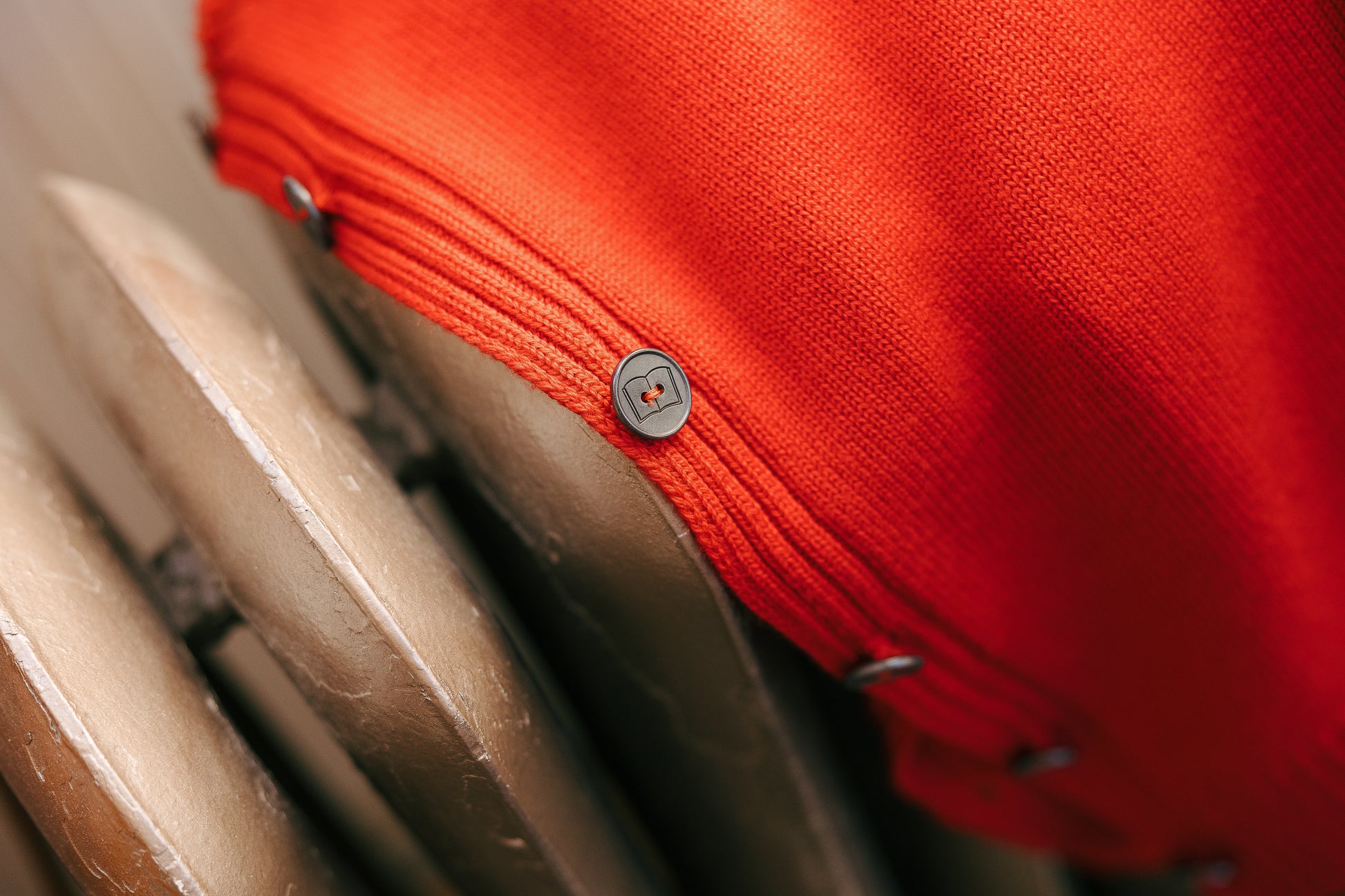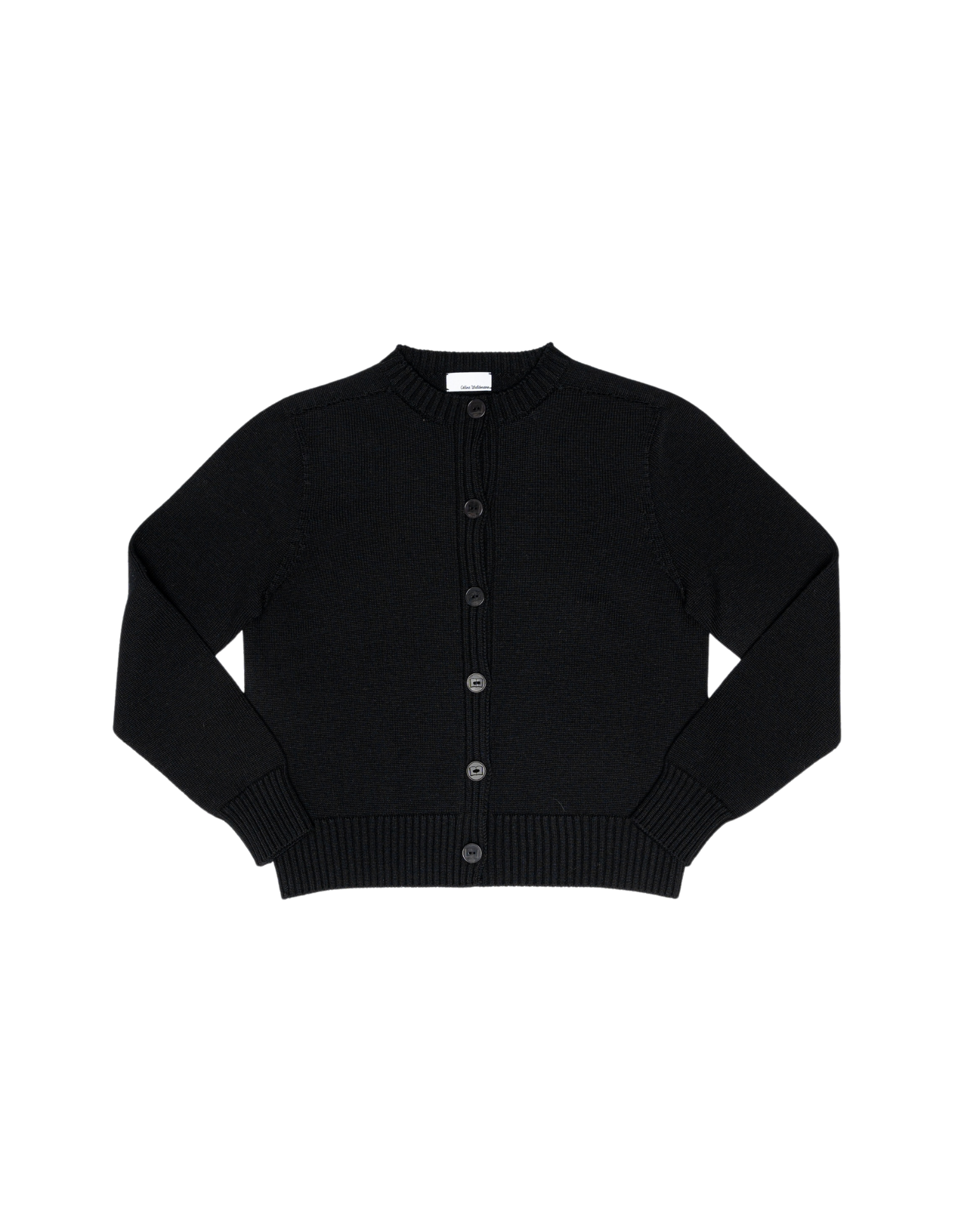 A crewneck mid-weight cardigan with Corozo buttons with our book logo. 3D knit with ribbing at neckline, cuffs, and hem. Try combining it with our Phoebe Vest or Margarita Short Sleeve Sweater for a twinset look. All colors have black buttons with a slight tortoise shell pattern. Lauren in 5'9" and is wearing a size XS. An overview of our Merino wool colors is available here.