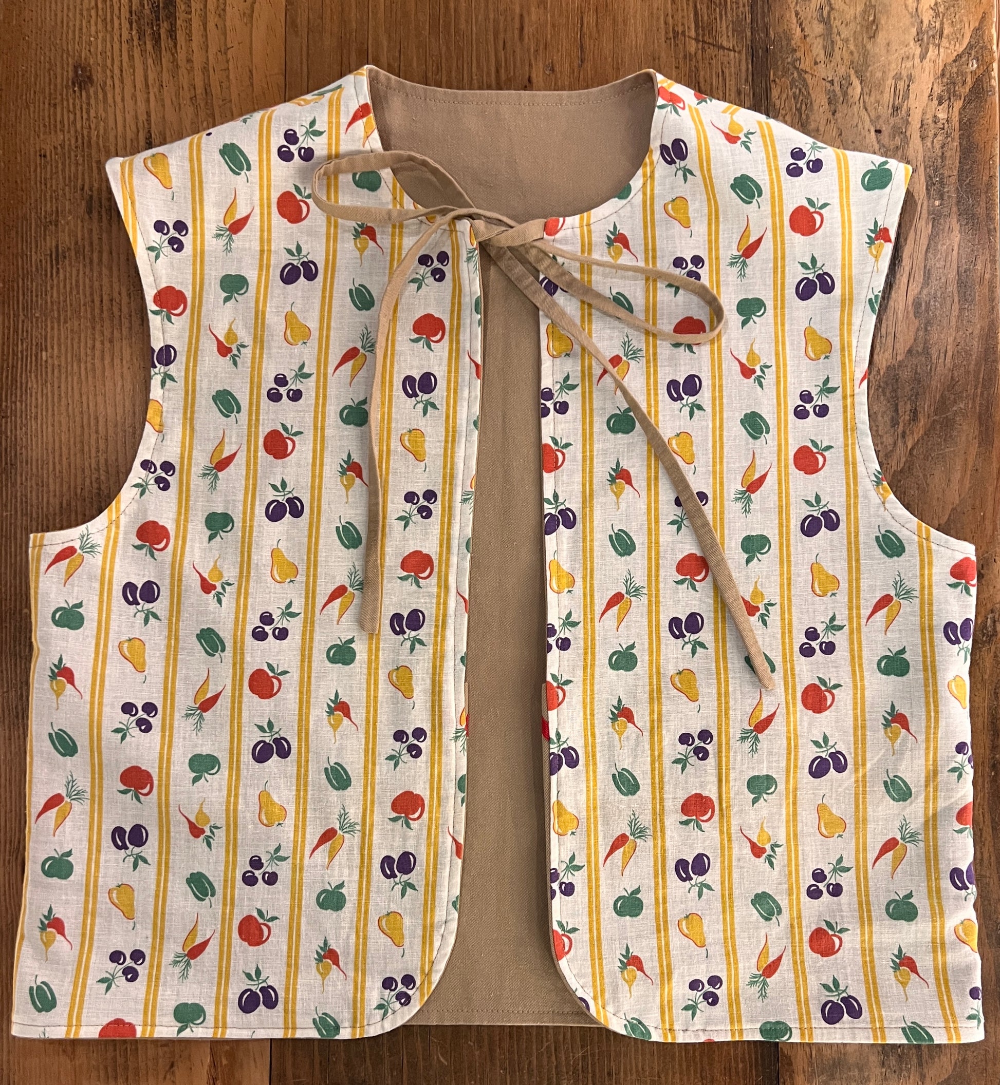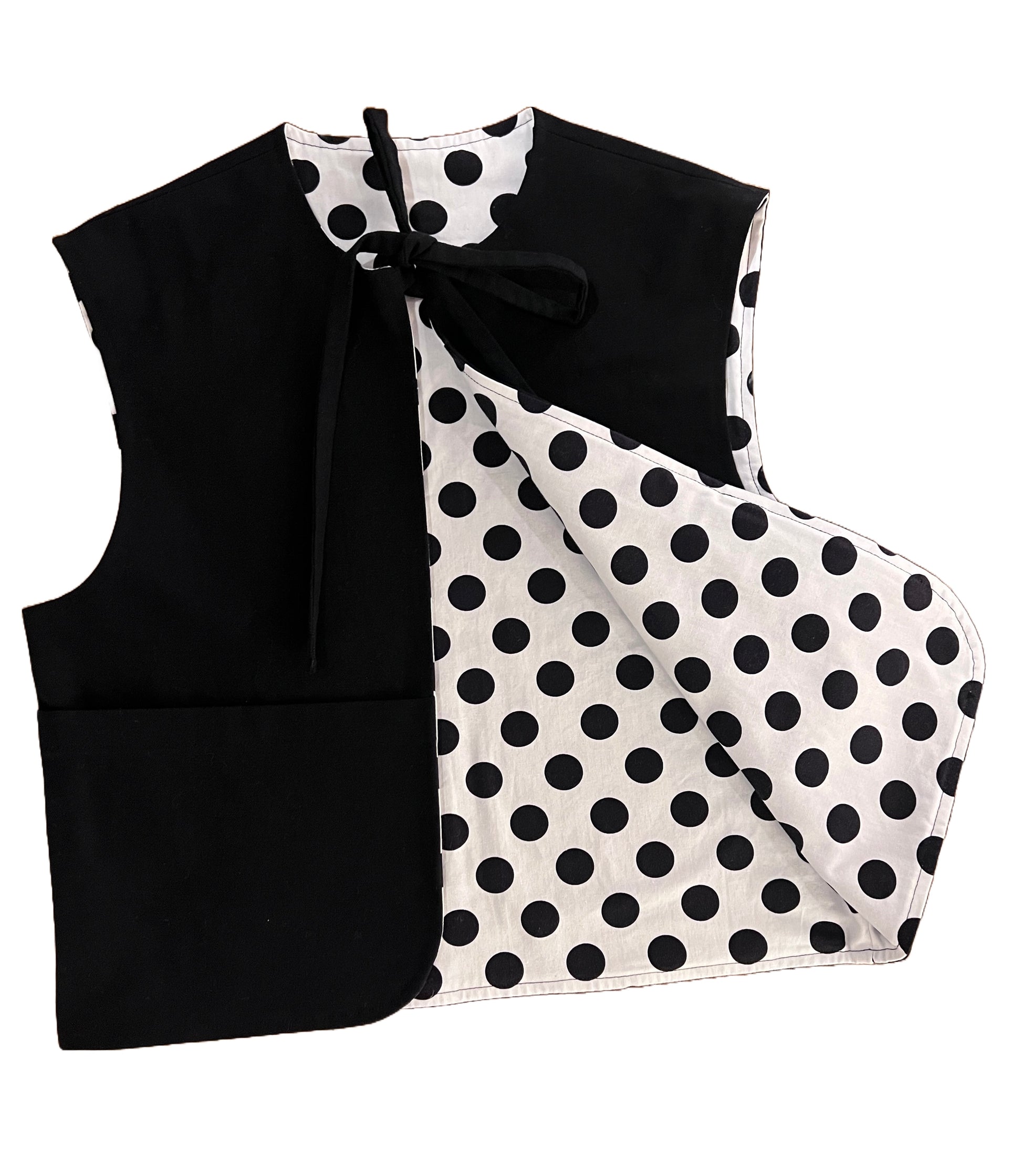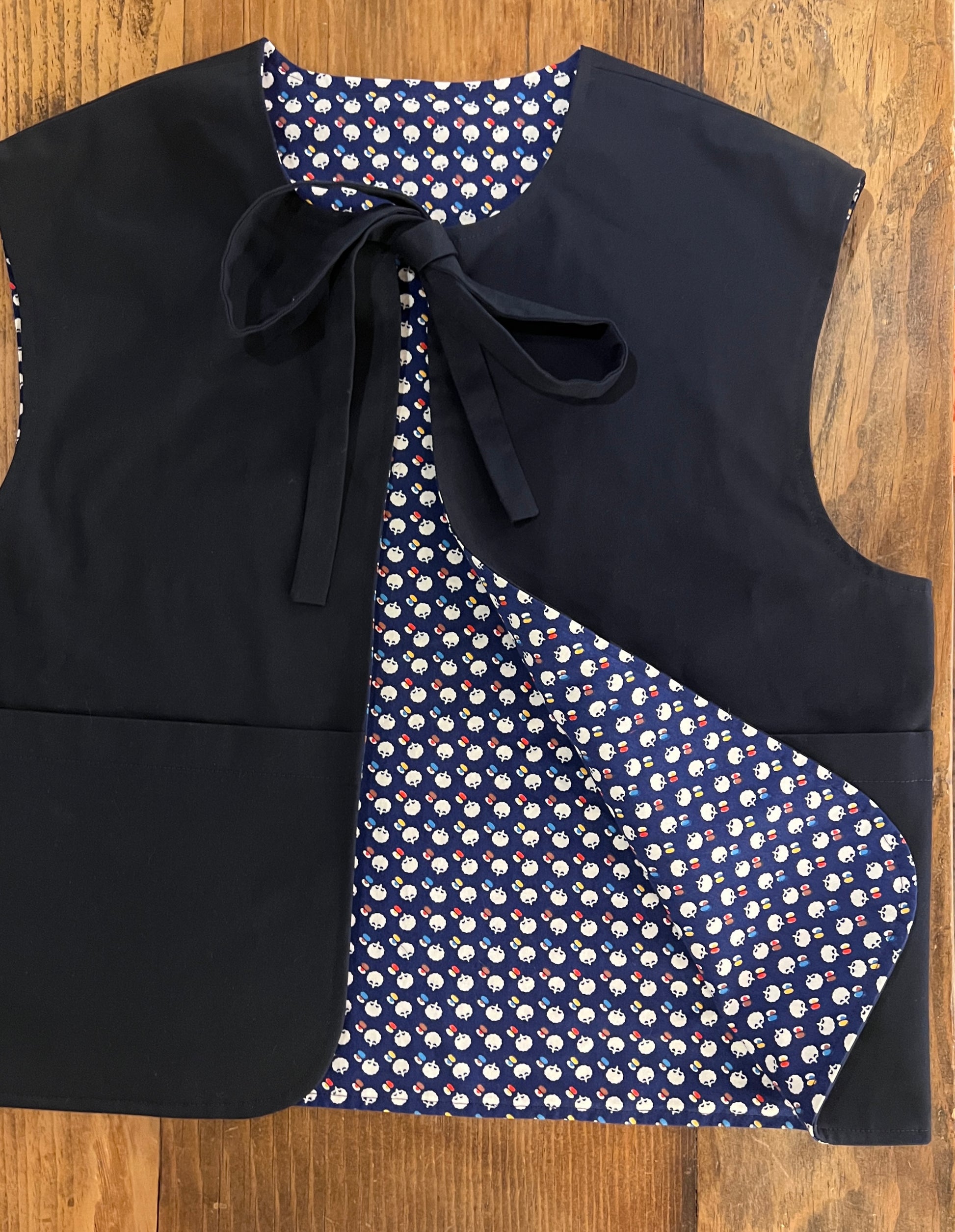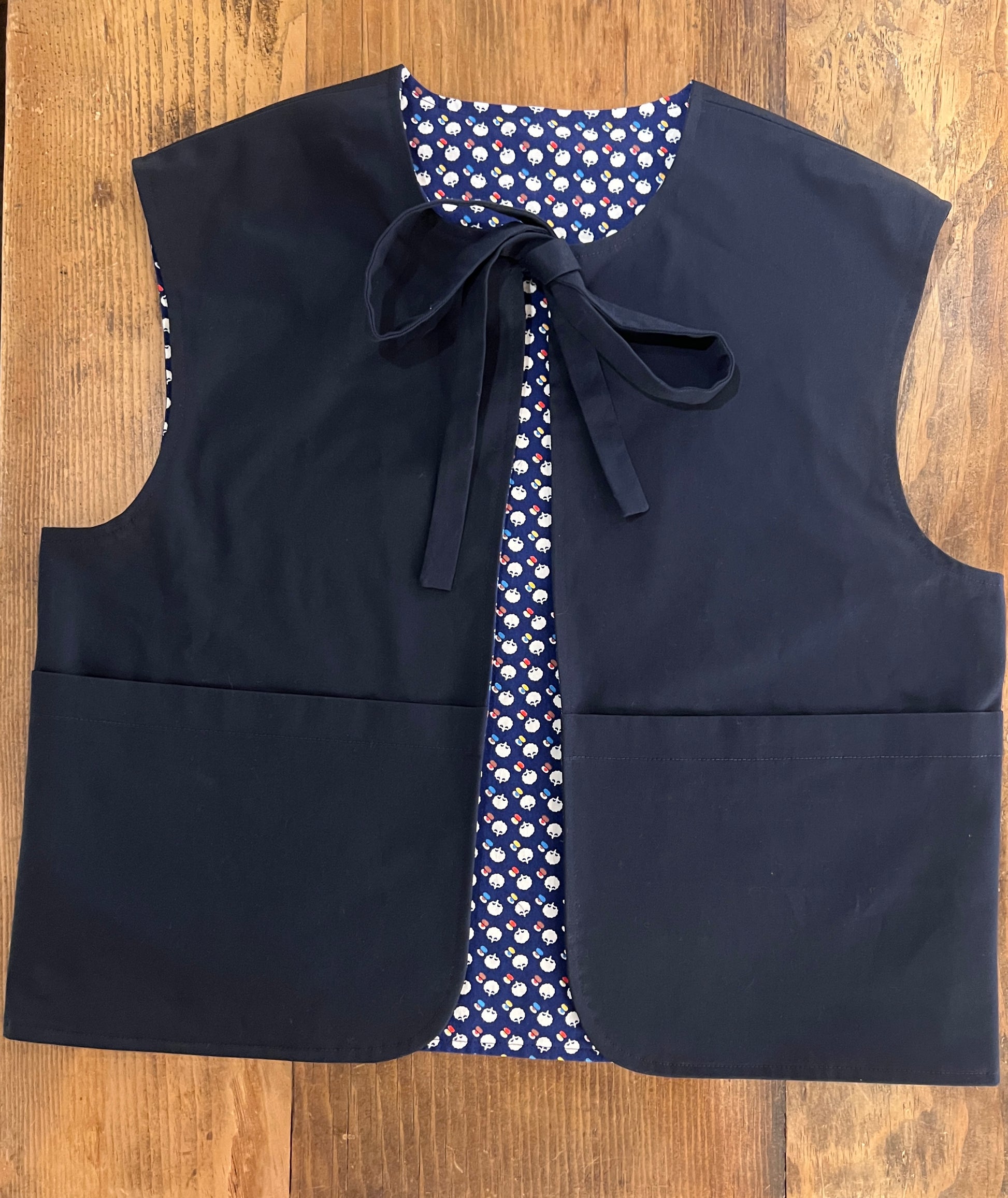 Reversible cotton vest with tie closure at the neck. Unisex, slightly cropped fit with a boxy cut. One side has two front pockets across the full width of the front, the other side has no pockets.