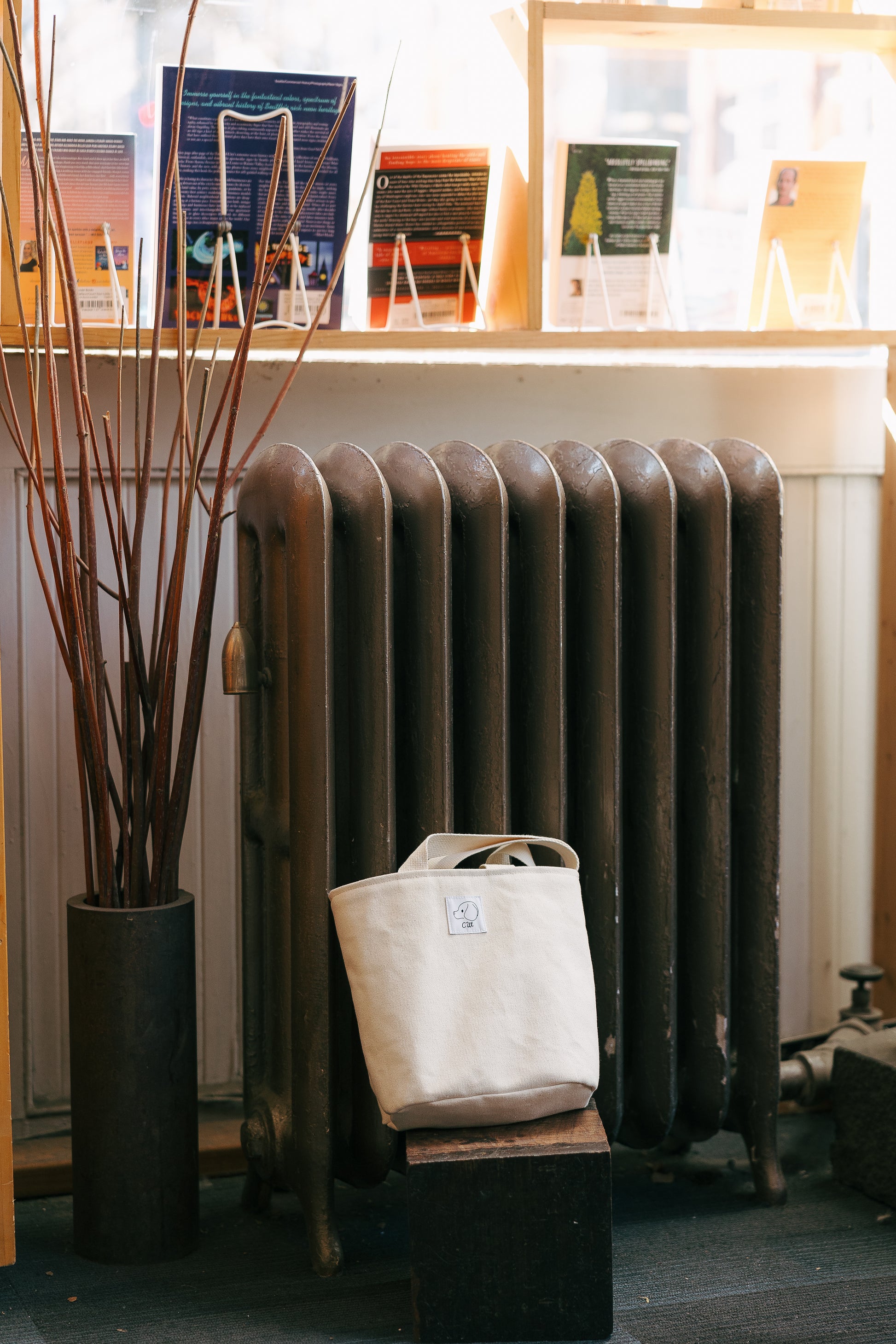 100% organic cotton canvas bucket tote. Lined with a silky organic cotton lawn. Even the webbing for the straps is organic cotton! The perfect little grab-and-go tote. Sturdy enough to stand on its own. Fits a book and all your other essentials. Best for when you just want to dump all your stuff into a bucket and take off. No fiddling with pockets or closures.