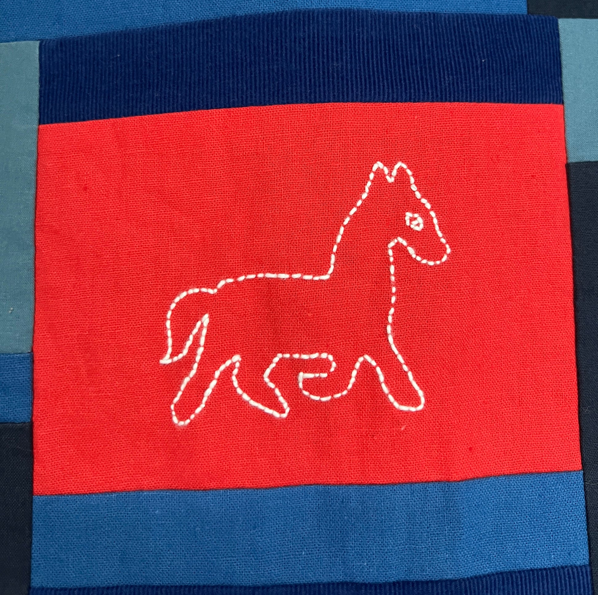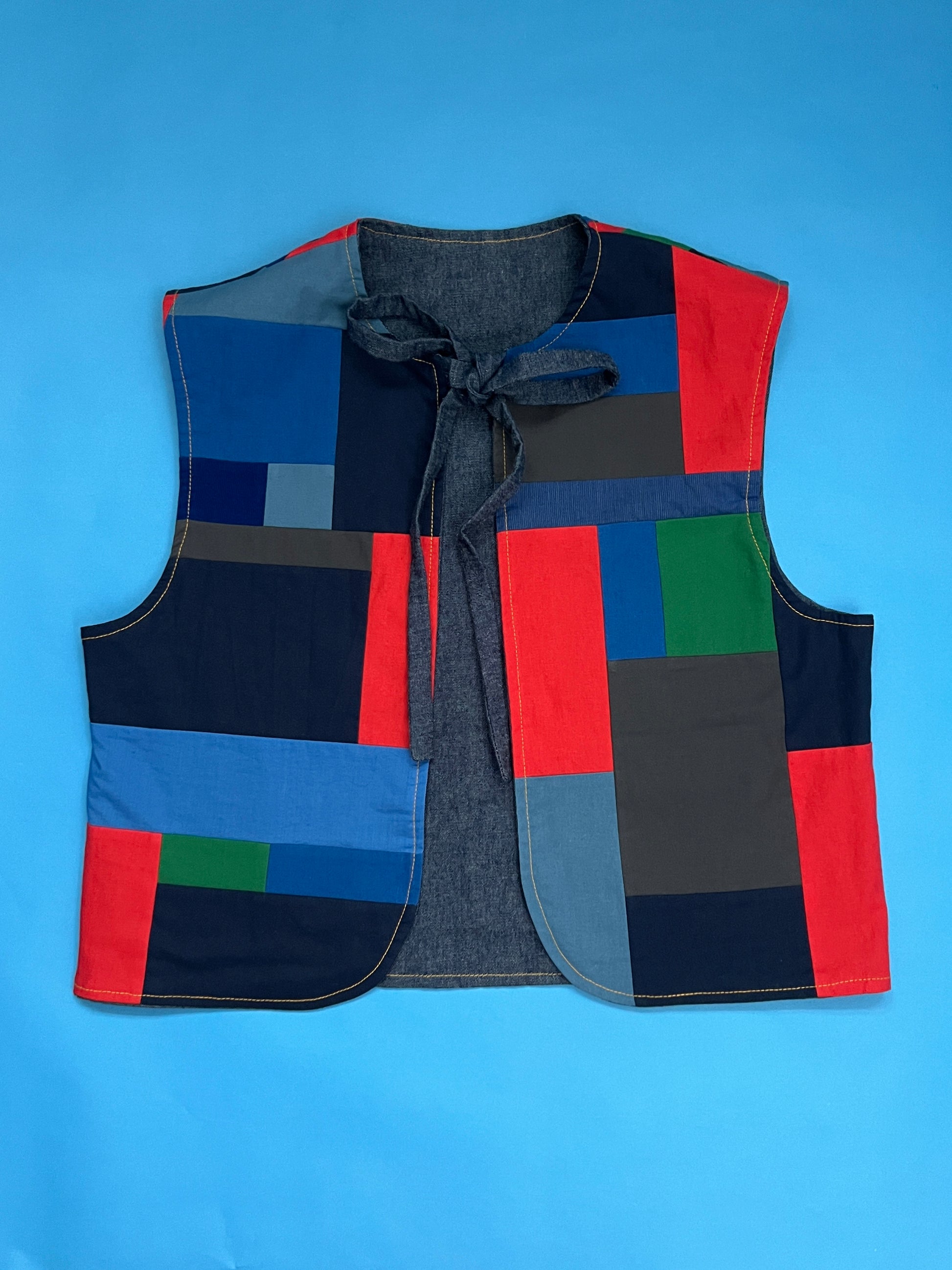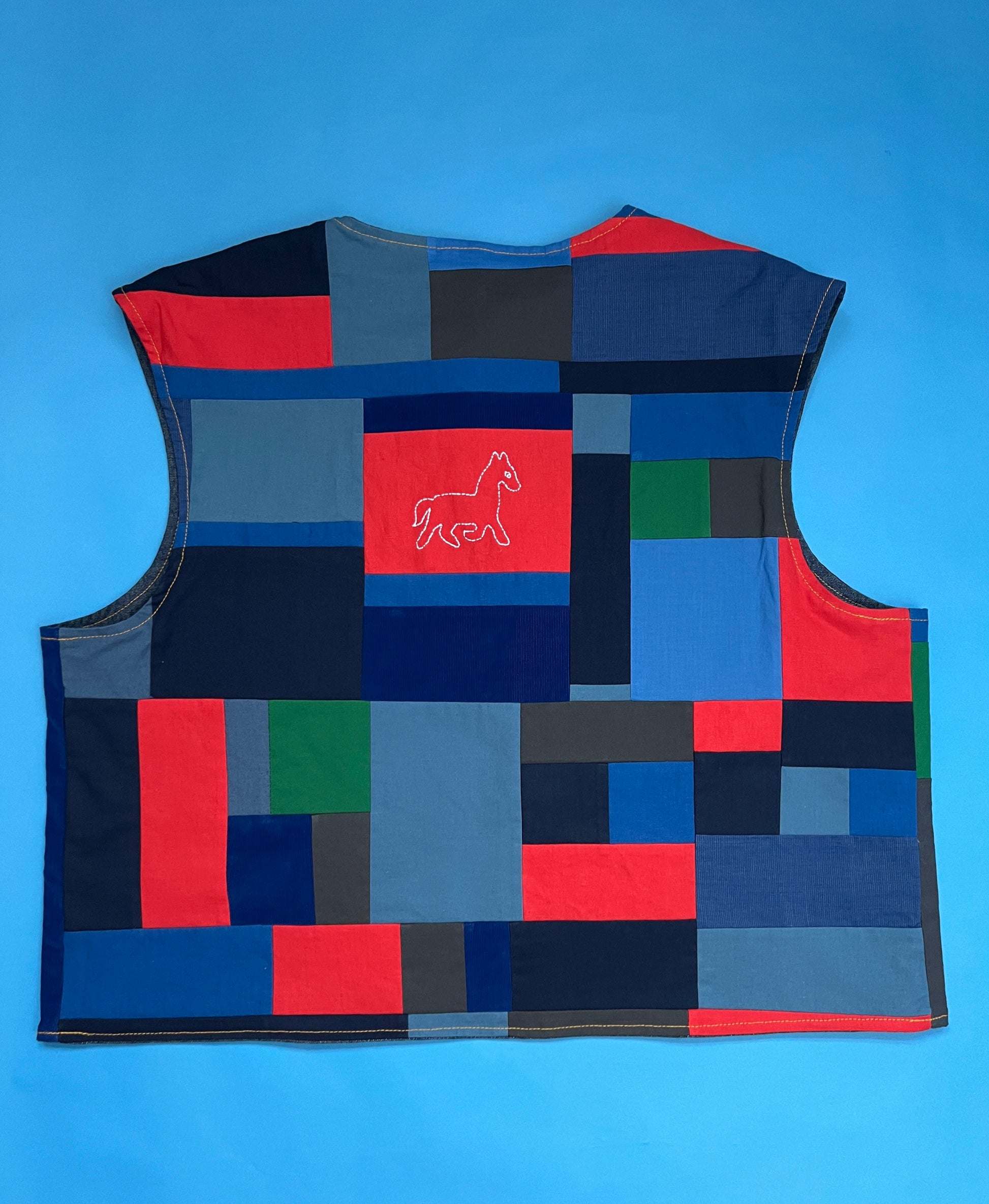 Each reversible vest has a one-of-a-kind patchwork design with a hand-embroidered horse on the back. The patchwork is made of cotton and cotton-linen blend remnant pieces from past projects. The textiles are a combination of new, organic, and deadstock fabrics. They reverse to a deadstock vintage cotton chambray with double needle topstitched patchwork pockets. The tag is in the pocket so that the vests are fully reversible. The year is hand-embroidered into the left pocket.