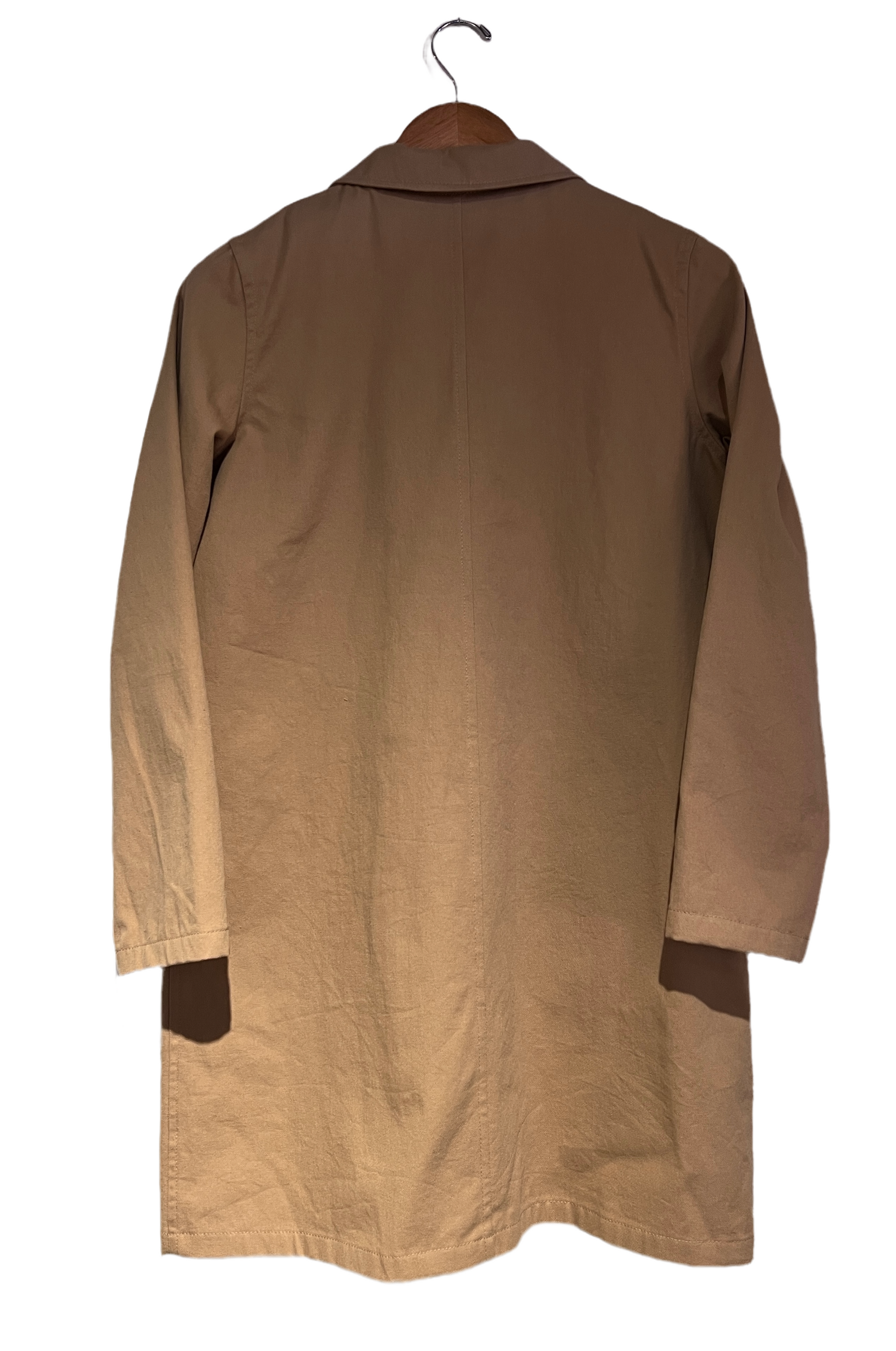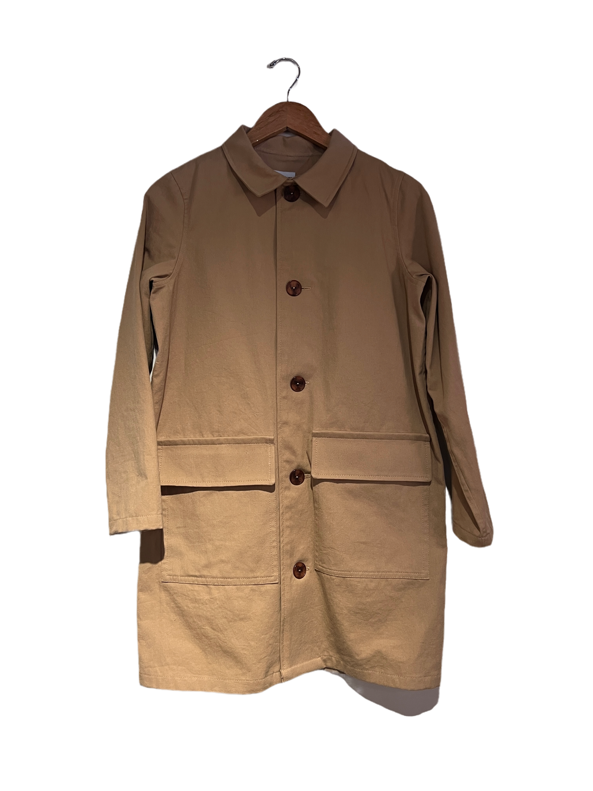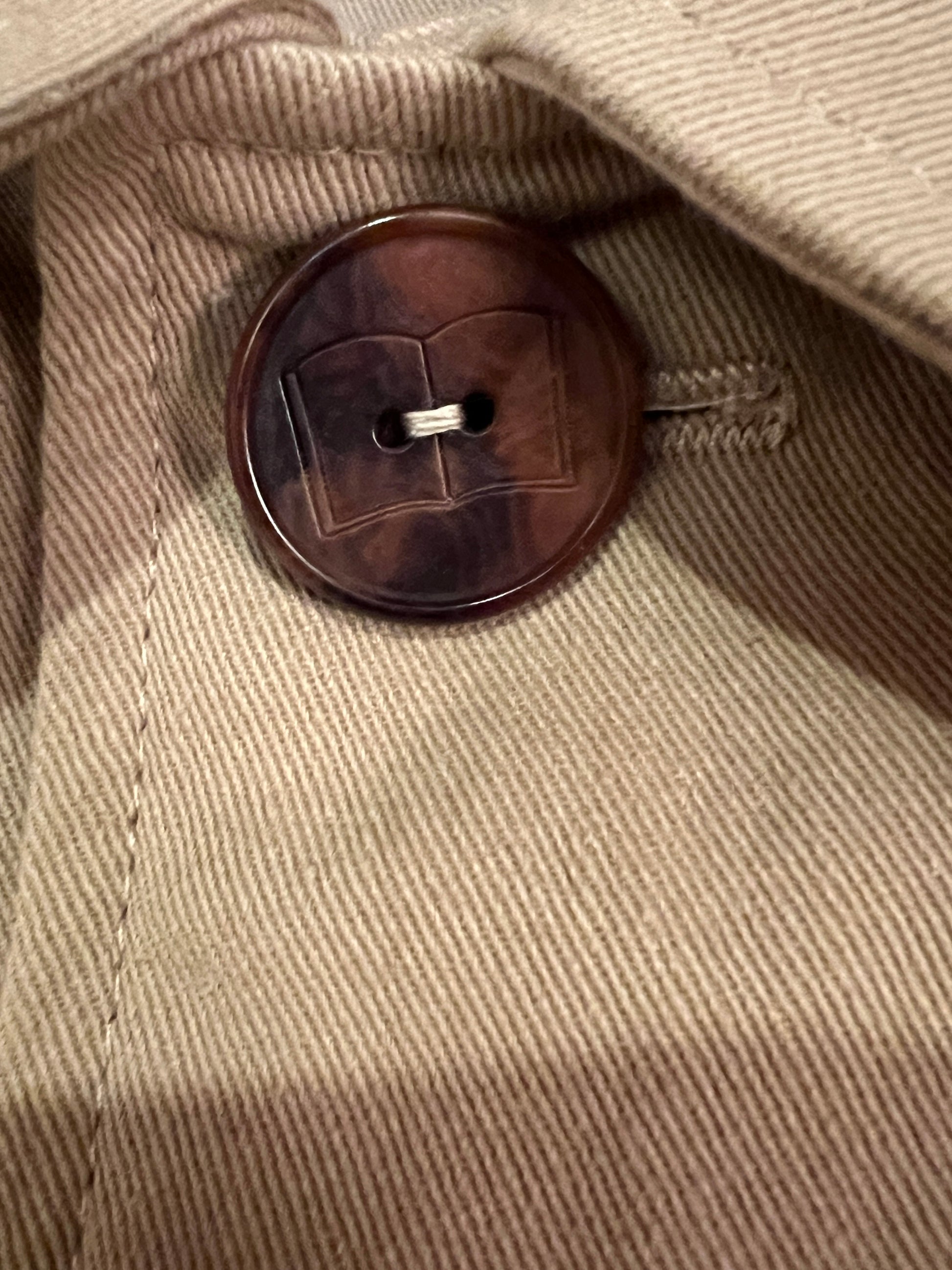 Made of lightweight deadstock designer cotton twill with a slightly slubby texture. Unlined, no back vent, fuss free! With custom Corozo buttons engraved with our book logo. Corozo is made from the tagua nut and is fully biodegradable.