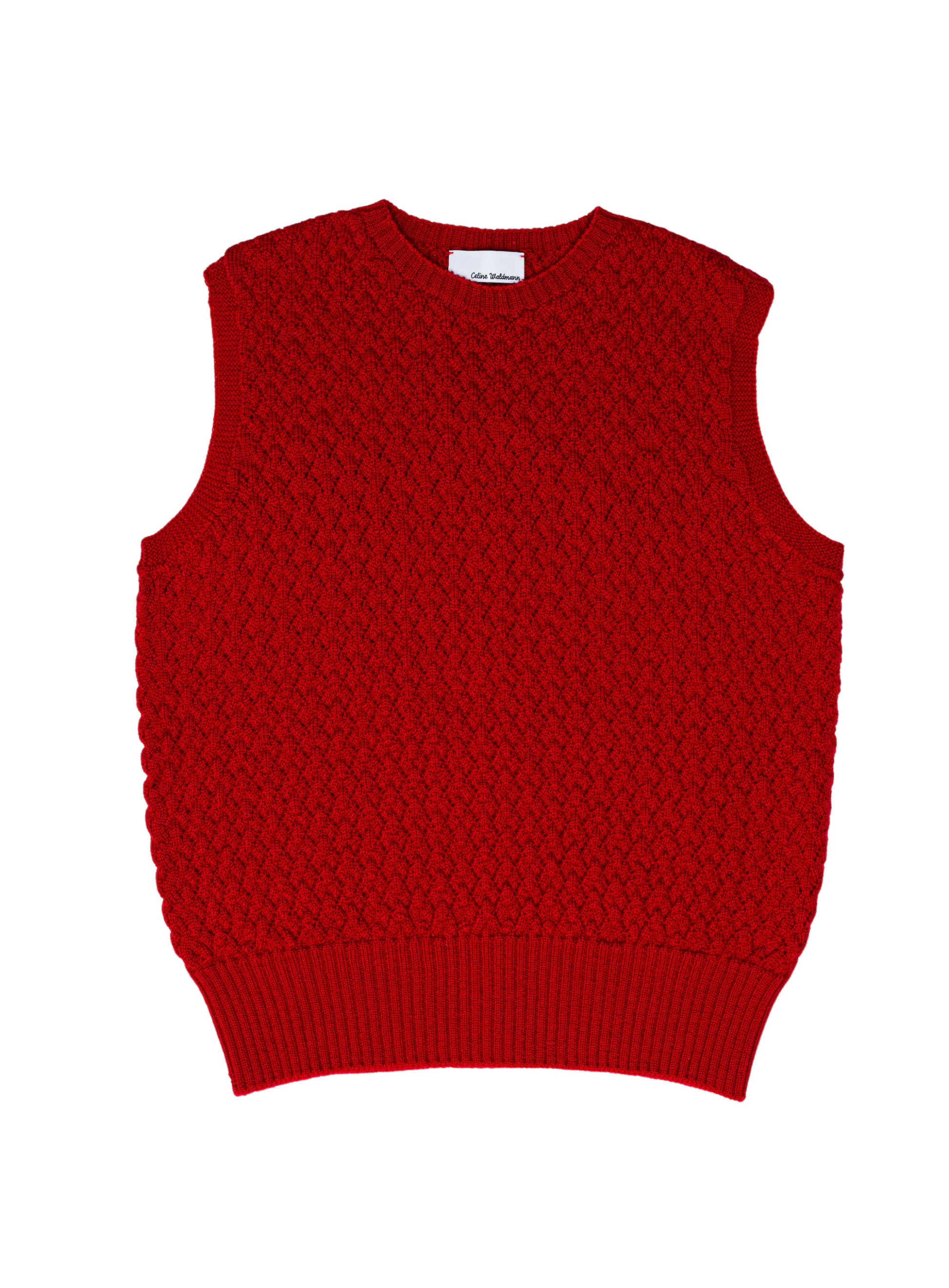 A pointelle knit sweater vest with a crewneck. Can be worn alone as a sweater shell or layered over another garment. Ribbing at neck, armholes, and hem. Akira is 5'8" and is wearing a size S. An overview of our Merino wool colors is available here.