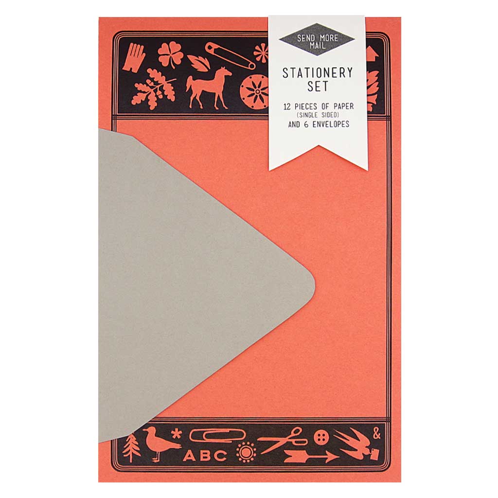 This stationery set comes with 12 identical single sided bold & nostalgic pieces of paper and 6 grey envelopes. Paper folds in half to fit inside the 4 ¼” x 5 ½” envelopes.